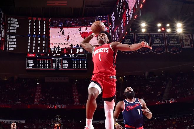当然下半场,到了比赛后期找到状态的申京和祖巴茨展开互爆,突破中转身命中抛投。虽然祖巴茨整体表现更胜一筹,不过申京赢下了关键回合,笑到了最后。而本场比赛的关键先生,毫无疑问还是阿门·汤普森,出战41分钟得到20分,关键时刻更不用说了。而翻看全场比赛,火箭队能够战胜快船,赢球之匙依旧是篮板球。作为联盟顶级的篮板球球队,火箭队又一次制霸了篮下。全场摘下51个篮板球,比快船队足足多了23个,领先接近一倍!这场比赛,火箭队有3名球员的篮板球超过9个,分别是15个的申京,10个的小贾巴里,以及9个的阿门。最重要的是,51个篮板球里包括22个前场篮板。